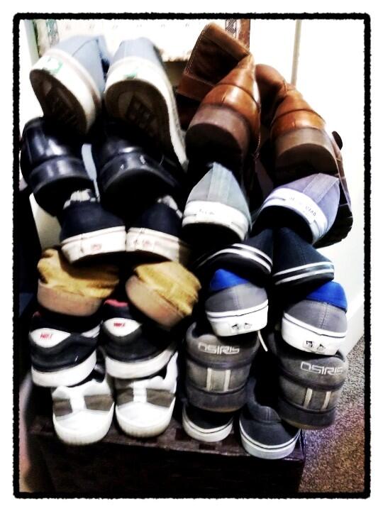 I cleaned my house very well today. It was one of those days where I got everything done and it all looks fabulous. At one point in my cleaning, I piled all of Sean's shoes on top of our laundry hamper so I could vacuum under them. This is that time: